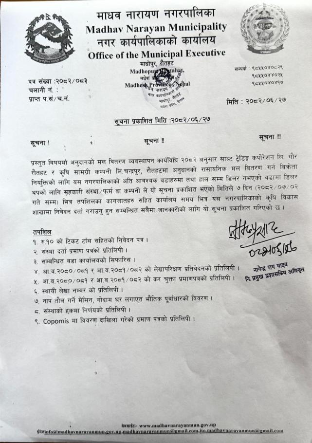 कृषि मल खाद बिक्रेता नियुक्तिको निवेदन सम्बन्धि ७ दिने सूचना !!!