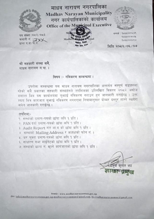 नविकरण सम्बन्धमा, माधव नारायण नगरपालिका अन्तर्गतका श्री सहकारी संस्थाहरु सबै !!!