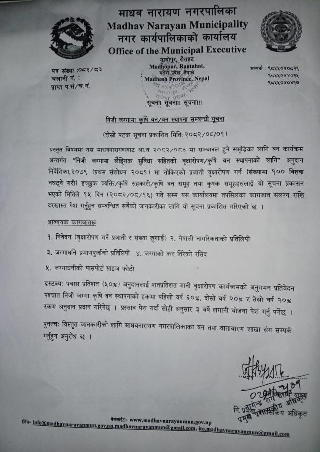 निजि जग्गामा कृषि वन स्थापना सम्बन्धि सूचना !!!