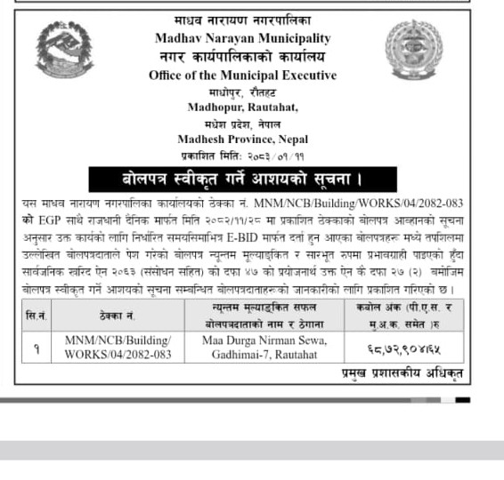 बोलपत्र स्विकृत गर्ने आशयको सूचना सम्बन्धमा ।