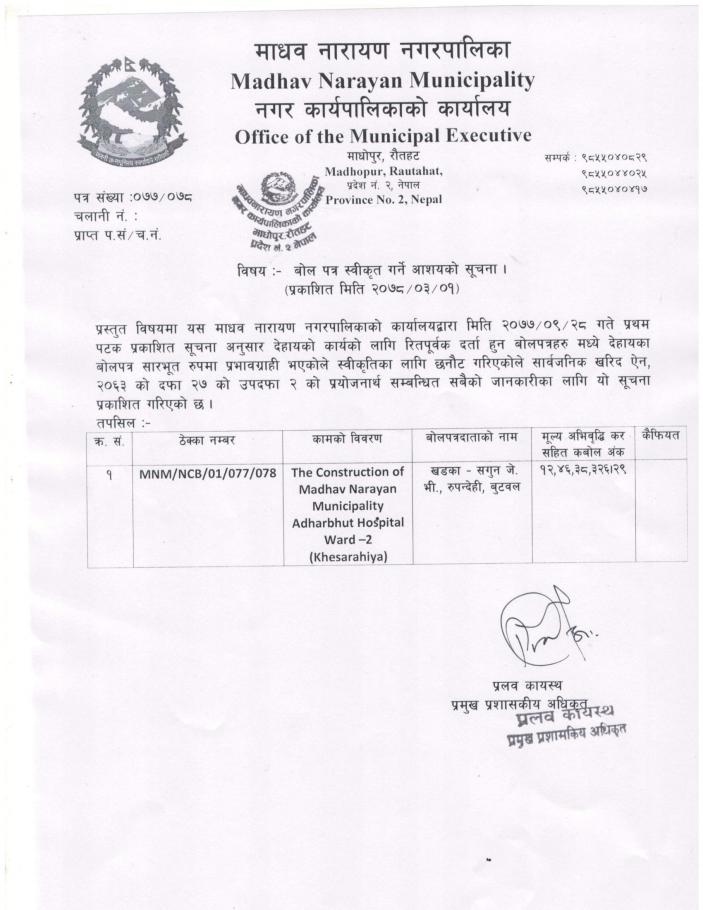 बोल पत्र स्वीकृत गर्ने आशयको सूचना !